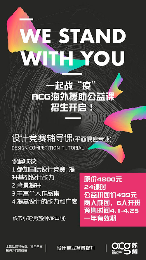 暖融融的四月已經到來,國內的疫情終于好轉,卻在全球開始大流行。在海外疫情最嚴重的意大利,隔離在家的人們在陽臺上上演著特別的“文藝復興”,用藝術互相鼓勵:“再見,明天見~”,讓人不由想起武漢鼓舞人心的賞櫻約定。ACG蘇州用心傾聽海內外學生的聲音,匯集整理海內外學生需求,特別推出:設計專業(yè)技能必修課。為空窗期同學輔導專業(yè)必修技能,課程收益將用于支援海外同胞!