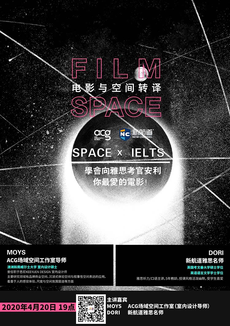4月20日ACG場(chǎng)域空間設(shè)計(jì)工作室的Moys導(dǎo)師在線與大家分享“電影的空間轉(zhuǎn)譯”!ACG還邀請(qǐng)到新航道資深雅思老師Dori,與大家分享“如何向雅思考官安利你最愛(ài)的電影”!一起看看都有哪些精彩內(nèi)容吧~