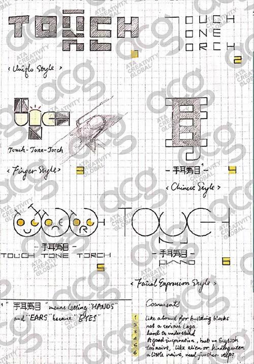 Logo Design建立在大量的調(diào)研和各種方案草圖上面,我想要傳達(dá)的中心思想就是【手耳為目】。Logo的設(shè)計(jì)主要運(yùn)用了雙關(guān)語(yǔ)的形式,“Touch”(手)可以是彈鋼琴的動(dòng)作;“Tone”(耳朵)是鋼琴發(fā)出的聲音;“Torch”(眼睛)是學(xué)員最終可以通過(guò)學(xué)習(xí)鋼琴而獲得的“光明”。橙色部分是中文中的手和耳。手耳的疊加組合就像眼睛一樣,寓意手和耳朵可以使眼睛重新感受到光明。