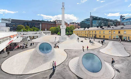由于城市規(guī)劃不允許將建筑延伸到地面之上,博物館和JKMM商量決定,將建筑延伸到以前用作公交車站的庭院之下。整個改造項目真正的看點就在這個作為屋頂的公共空間。大大小小的一系列結構穹頂,讓整個廣場看起來趣味十足。傾斜的投射天窗為地下展廳帶去自然光,而在地面上又像是一個個露出頭的潛望鏡一般,創(chuàng)造了一個獨特的形狀的公共空間。