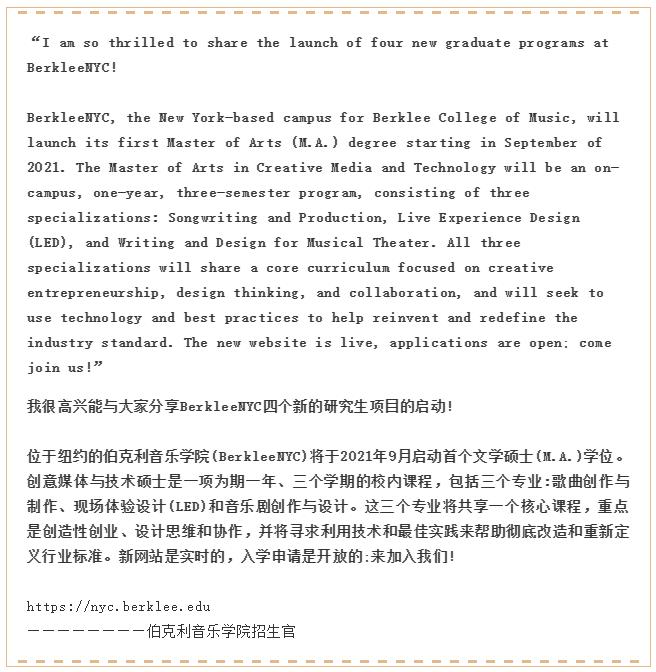 BerkleeNYC,伯克利在紐約市的校園,將推出其第一個(gè)研究生課程在9月開始2021年藝術(shù)創(chuàng)意媒體技術(shù)碩士是一個(gè)為期一年,校園計(jì)劃由三個(gè)專業(yè):詞曲創(chuàng)作與制作,現(xiàn)場體驗(yàn)音樂劇的設(shè)計(jì),寫作和設(shè)計(jì)。這三個(gè)專業(yè)將共享一個(gè)核心課程,側(cè)重于創(chuàng)新企業(yè)家精神,設(shè)計(jì)思維和協(xié)作。該大學(xué)進(jìn)行的研究發(fā)現(xiàn),在劇院,現(xiàn)場活動(dòng)和節(jié)日中,對(duì)具有強(qiáng)大技術(shù)技能,缺乏專門針對(duì)當(dāng)前實(shí)踐和技術(shù)的研究生課程的創(chuàng)意提出了強(qiáng)烈要求。