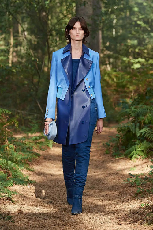 模特們從森林深處款款而出,莊重的神情,仿佛在舉行一次大型的祭祀,根據(jù)Riccardo Tisci表述,正是疫情期間的封鎖,讓他得以重新思考“生”的意義,重組、解構(gòu),帆布、單寧、橡膠圖層...多種材料相互交替,儼然譜寫出了一場新奇的時裝大秀。