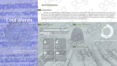 同時(shí)這個(gè)項(xiàng)目也在探討如何應(yīng)對這種情況,當(dāng)老年人上當(dāng)受騙時(shí),我們所做的指責(zé)和訓(xùn)導(dǎo)其實(shí)都是“Cold words”,這些看似好心的“規(guī)勸”起不到任何正面作用,呼吁大家從生活中多關(guān)心老人,讓老人感覺備受關(guān)注,從而減少受騙的風(fēng)險(xiǎn)。