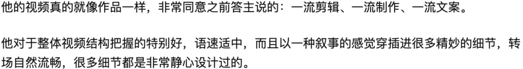 何同學(xué)的進(jìn)步速度非常之快,有一位知乎答主的描述很準(zhǔn)確:他的視頻真的就像作品一樣,一流剪輯、一流制作、一流文案。