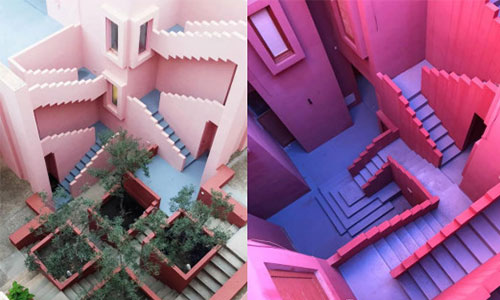 西班牙的Muralla Roja是紀(jì)念碑谷的原型,大家可以感受下韋斯安德森式的配色。這個地方看上去沒人,實際上是個居住區(qū),是由西班牙著名建筑設(shè)計師里卡多·波菲(Ricardo Bofill)在1968年親自設(shè)計,1973 年建成。