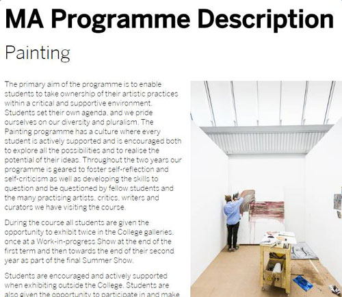 RCA純藝在同類(lèi)型院校專(zhuān)業(yè)排名中名列第一,課程劃分非常詳細(xì),包括雕塑、繪畫(huà)、版畫(huà)、攝影等專(zhuān)業(yè)。要想申請(qǐng)純藝專(zhuān)業(yè),所制作的作品集必須要相對(duì)成熟,需要大多是完成作品,并且還要在展廳或者一個(gè)空間里展出,更重要的是作品集要求有明確的個(gè)人風(fēng)格和方向。