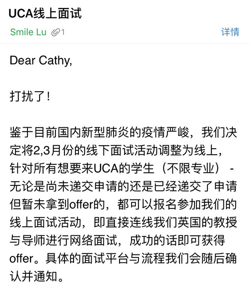 隨著疫情的發(fā)展,UCA將線下活動調(diào)整到了線上,對于尚未獲得offer的學(xué)生將進行線上面試。此外,目前的語言測試并沒做調(diào)整并承諾如有變化會及時聯(lián)系學(xué)生。此外,學(xué)校還在官方微信公眾號提供了相信的防護信息,這無疑體現(xiàn)了學(xué)校的人文主義關(guān)懷。