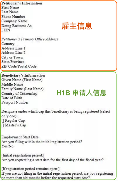 在該版本中,雇主需要填寫的信息包括姓名、電話號碼、公司名稱、行業(yè)、雇主身份號碼(FEIN)及辦公地址;H-1B申請人需要填寫的信息包括姓名、國籍、出生日期、護(hù)照號碼和抽簽種類(普通簽或碩士簽)。